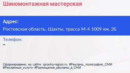 Шиномонтажная мастерская по адресу Ростовская область, Шахты, трасса М-4 1009 км, 2Б в дальнейшем Организация, размещена в следующих категориях: