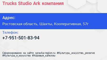Trucks Studio Ark, компания по адресу Ростовская область, Шахты, Кооперативная, 57г в дальнейшем Организация, размещена в следующих категориях: