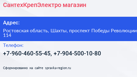 СантехКрепЭлектро, магазин по адресу Ростовская область, Шахты, проспект Победы Революции, 114 в дальнейшем Организация, размещена в следующих категориях: