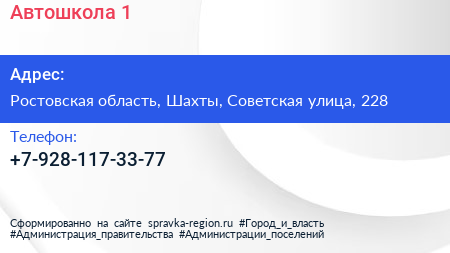 Автошкола №1 по адресу Ростовская область, Шахты, Советская улица, 228 в дальнейшем Организация, размещена в следующих категориях: