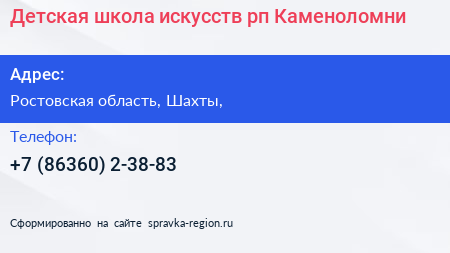 Детская школа искусств рп. Каменоломни по адресу Ростовская область, Шахты, в дальнейшем Организация, размещена в следующих категориях: