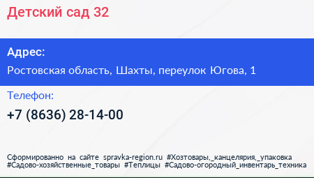 Детский сад №32 по адресу Ростовская область, Шахты, переулок Югова, 1 в дальнейшем Организация, размещена в следующих категориях: