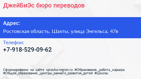 ДжейБиЭс, бюро переводов по адресу Ростовская область, Шахты, улица Энгельса, 47в в дальнейшем Организация, размещена в следующих категориях: