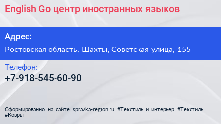 English Go, центр иностранных языков по адресу Ростовская область, Шахты, Советская улица, 155 в дальнейшем Организация, размещена в следующих категориях: