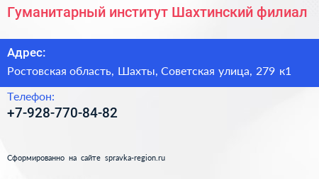 Гуманитарный институт, Шахтинский филиал по адресу Ростовская область, Шахты, Советская улица, 279 к1 в дальнейшем Организация, размещена в следующих категориях:
