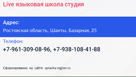 Live, языковая школа-студия по адресу Ростовская область, Шахты, Базарная, 25 в дальнейшем Организация, размещена в следующих категориях: