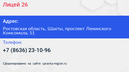 Лицей №26 по адресу Ростовская область, Шахты, проспект Ленинского Комсомола, 51 в дальнейшем Организация, размещена в следующих категориях: