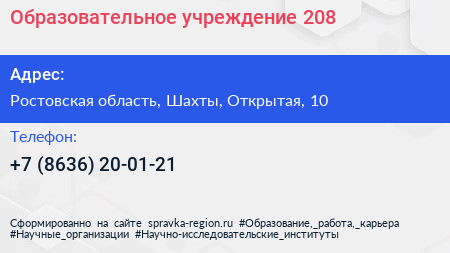 Образовательное учреждение №208 по адресу Ростовская область, Шахты, Открытая, 10 в дальнейшем Организация, размещена в следующих категориях: