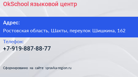 OkSchool, языковой центр по адресу Ростовская область, Шахты, переулок Шишкина, 162 в дальнейшем Организация, размещена в следующих категориях: