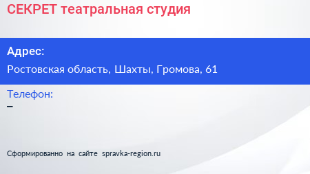 СЕКРЕТ, театральная студия по адресу Ростовская область, Шахты, Громова, 61 в дальнейшем Организация, размещена в следующих категориях: