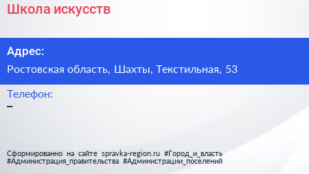 Школа искусств по адресу Ростовская область, Шахты, Текстильная, 53 в дальнейшем Организация, размещена в следующих категориях: