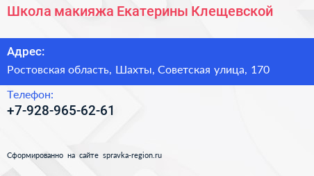 Школа макияжа Екатерины Клещевской по адресу Ростовская область, Шахты, Советская улица, 170 в дальнейшем Организация, размещена в следующих категориях: