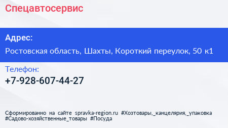 Спецавтосервис по адресу Ростовская область, Шахты, Короткий переулок, 50 к1 в дальнейшем Организация, размещена в следующих категориях: