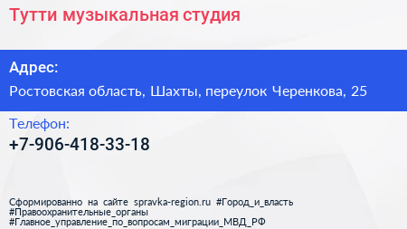 Тутти, музыкальная студия по адресу Ростовская область, Шахты, переулок Черенкова, 25 в дальнейшем Организация, размещена в следующих категориях: