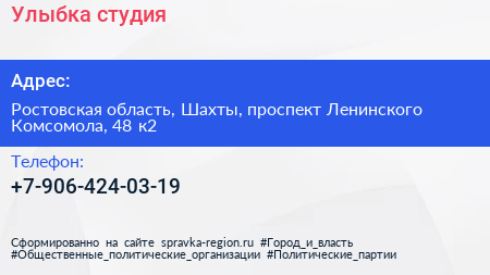 Улыбка, студия по адресу Ростовская область, Шахты, проспект Ленинского Комсомола, 48 к2 в дальнейшем Организация, размещена в следующих категориях: