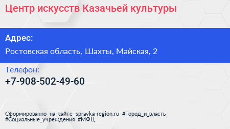 Центр искусств Казачьей культуры по адресу Ростовская область, Шахты, Майская, 2 в дальнейшем Организация, размещена в следующих категориях:
