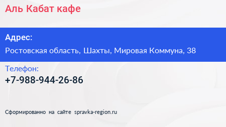 Аль-Кабат, кафе по адресу Ростовская область, Шахты, Мировая Коммуна, 38 в дальнейшем Организация, размещена в следующих категориях: