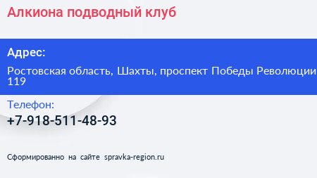 Алкиона, подводный клуб по адресу Ростовская область, Шахты, проспект Победы Революции, 119 в дальнейшем Организация, размещена в следующих категориях: