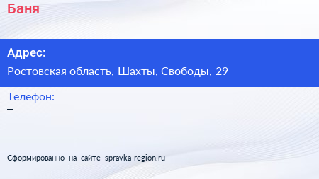 Баня по адресу Ростовская область, Шахты, Свободы, 29 в дальнейшем Организация, размещена в следующих категориях: