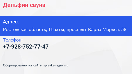 Дельфин, сауна по адресу Ростовская область, Шахты, проспект Карла Маркса, 58 в дальнейшем Организация, размещена в следующих категориях: