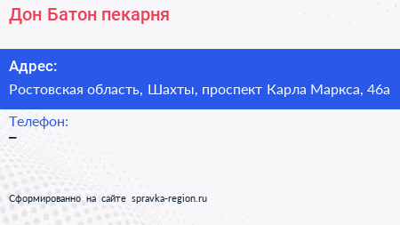 Дон Батон, пекарня по адресу Ростовская область, Шахты, проспект Карла Маркса, 46а в дальнейшем Организация, размещена в следующих категориях: