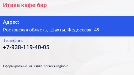 Итака, кафе-бар по адресу Ростовская область, Шахты, Федосеева, 49 в дальнейшем Организация, размещена в следующих категориях: