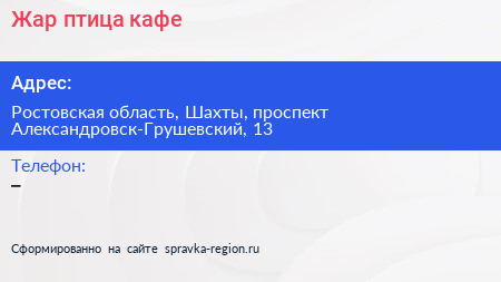Жар-птица, кафе по адресу Ростовская область, Шахты, проспект Александровск-Грушевский, 13 в дальнейшем Организация, размещена в следующих категориях: