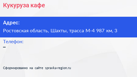 Кукуруза, кафе по адресу Ростовская область, Шахты, трасса М-4 987 км, 3 в дальнейшем Организация, размещена в следующих категориях: