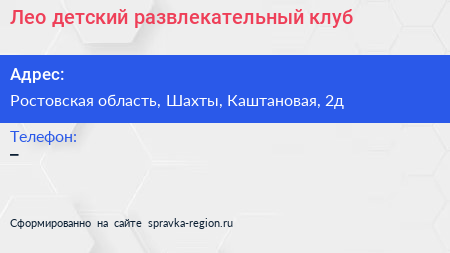 Лео, детский развлекательный клуб по адресу Ростовская область, Шахты, Каштановая, 2д в дальнейшем Организация, размещена в следующих категориях: