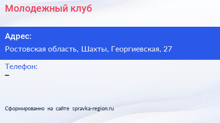 Молодежный, клуб по адресу Ростовская область, Шахты, Георгиевская, 27 в дальнейшем Организация, размещена в следующих категориях:
