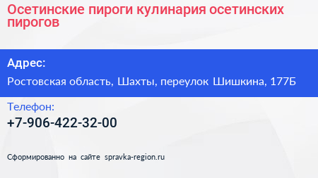 Осетинские пироги, кулинария осетинских пирогов по адресу Ростовская область, Шахты, переулок Шишкина, 177Б в дальнейшем Организация, размещена в следующих категориях: