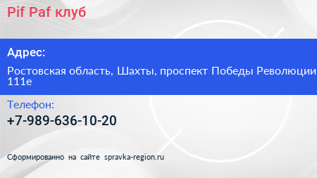 Pif-Paf, клуб по адресу Ростовская область, Шахты, проспект Победы Революции, 111е в дальнейшем Организация, размещена в следующих категориях: