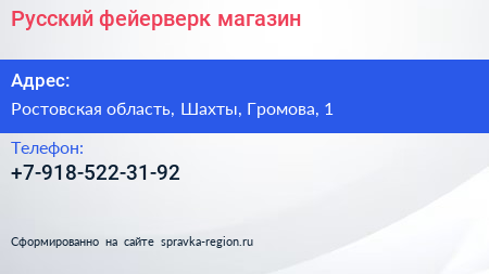 Русский фейерверк, магазин по адресу Ростовская область, Шахты, Громова, 1 в дальнейшем Организация, размещена в следующих категориях: