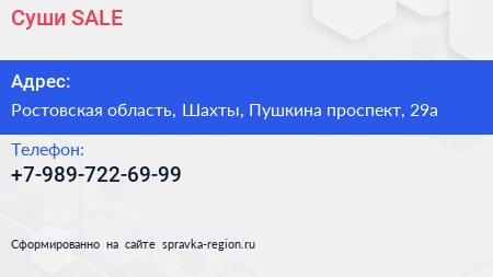 Суши SALE по адресу Ростовская область, Шахты, Пушкина проспект, 29а в дальнейшем Организация, размещена в следующих категориях: