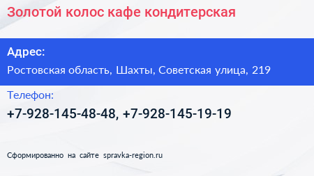 Золотой колос, кафе-кондитерская по адресу Ростовская область, Шахты, Советская улица, 219 в дальнейшем Организация, размещена в следующих категориях: