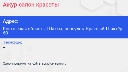 Ажур, салон красоты по адресу Ростовская область, Шахты, переулок Красный Шахтёр, 60 в дальнейшем Организация, размещена в следующих категориях: