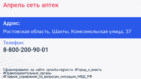 Апрель, сеть аптек по адресу Ростовская область, Шахты, Комсомольская улица, 37 в дальнейшем Организация, размещена в следующих категориях: