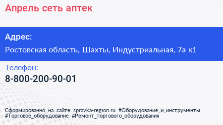 Апрель, сеть аптек по адресу Ростовская область, Шахты, Индустриальная, 7а к1 в дальнейшем Организация, размещена в следующих категориях: