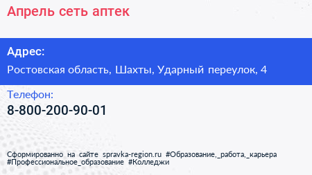 Апрель, сеть аптек по адресу Ростовская область, Шахты, Ударный переулок, 4 в дальнейшем Организация, размещена в следующих категориях: