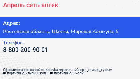 Апрель, сеть аптек по адресу Ростовская область, Шахты, Мировая Коммуна, 5 в дальнейшем Организация, размещена в следующих категориях: