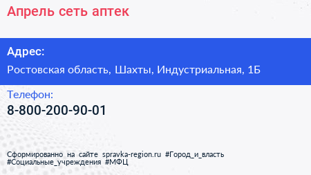 Апрель, сеть аптек по адресу Ростовская область, Шахты, Индустриальная, 1Б в дальнейшем Организация, размещена в следующих категориях: