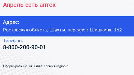 Апрель, сеть аптек по адресу Ростовская область, Шахты, переулок Шишкина, 162 в дальнейшем Организация, размещена в следующих категориях: