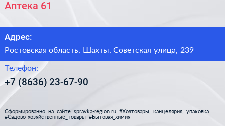 Аптека 61 по адресу Ростовская область, Шахты, Советская улица, 239 в дальнейшем Организация, размещена в следующих категориях: