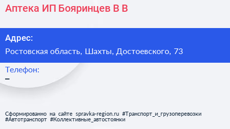 Аптека, ИП Бояринцев В.В. по адресу Ростовская область, Шахты, Достоевского, 73 в дальнейшем Организация, размещена в следующих категориях: