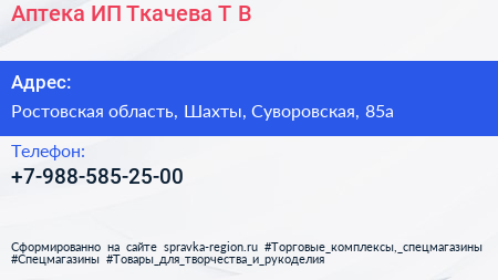 Аптека, ИП Ткачева Т.В. по адресу Ростовская область, Шахты, Суворовская, 85а в дальнейшем Организация, размещена в следующих категориях: