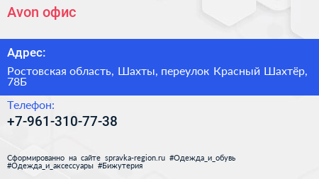 Avon, офис по адресу Ростовская область, Шахты, переулок Красный Шахтёр, 78Б в дальнейшем Организация, размещена в следующих категориях: