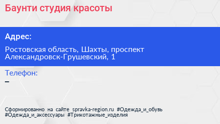 Баунти, студия красоты по адресу Ростовская область, Шахты, проспект Александровск-Грушевский, 1 в дальнейшем Организация, размещена в следующих категориях: