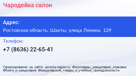 Чародейка, салон по адресу Ростовская область, Шахты, улица Ленина, 129 в дальнейшем Организация, размещена в следующих категориях: