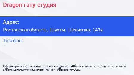 Dragon, тату-студия по адресу Ростовская область, Шахты, Шевченко, 143а в дальнейшем Организация, размещена в следующих категориях: