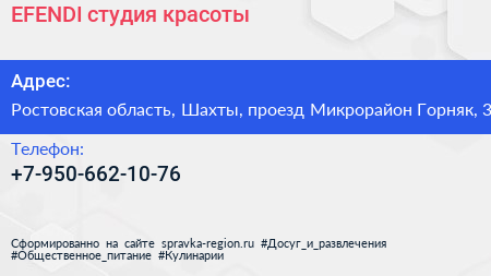 EFENDI, студия красоты по адресу Ростовская область, Шахты, проезд Микрорайон Горняк, 3 в дальнейшем Организация, размещена в следующих категориях: